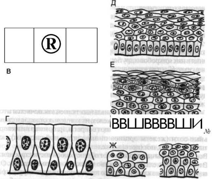 А, Б, В - однослойные (А - плоский, Б - кубический, В - цилиндрический); Г - многорядный; Д, Е - многослойные (Д - неороговевающий, Е - ороговевающий); Ж - переходный: слева — в состоянии наполнении органа, справа — в его спавшемся состоянии (по Е. А. Шубниковой, 1981)