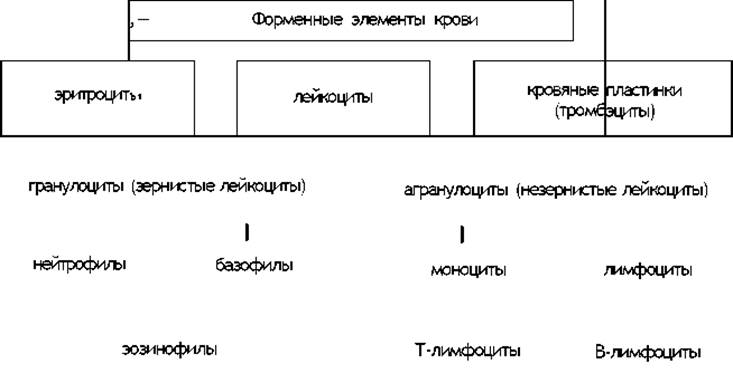 Кровь и лимфа. Это жидкие виды тканей внутренней среды. Они содержат около 80% воды и около 20% органических веществ, имея удельный вес около 1,055. Общее количество крови достигает у мужчин приблизительно 4,5 л, а у женщин — 4 л. Кровь и лимфа состоят из плазмы и форменных элементов (рис. 5). Общая масса форменных элементов составляет 1/3—2/5 объема всей крови, в то время как плазмы — 2/3—3/5 этого объема. Среди форменных элементов крови различают красные и белые кровяные тельца (см. схему 2).