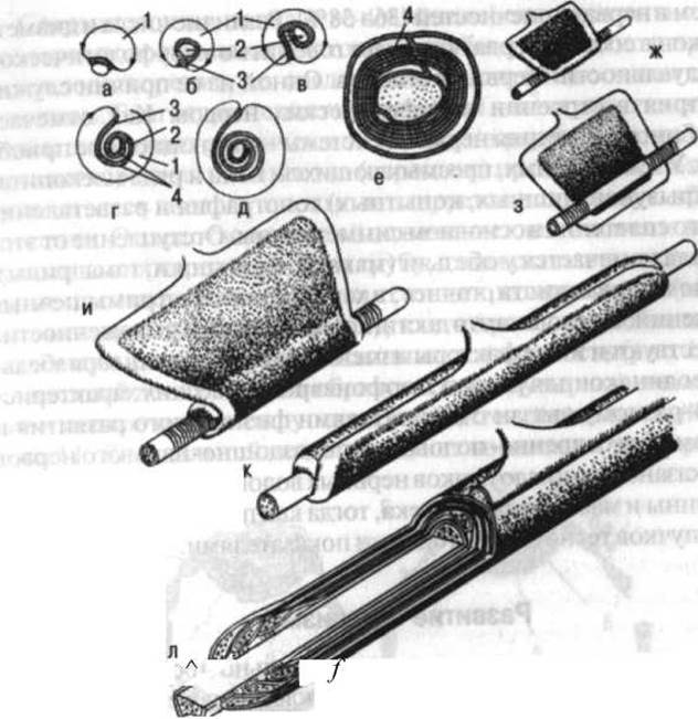 Рис. 10. Схема миелинизации нервного волокна: а—е — последовательные стадии вращения мезаксона вокруг аксона на поперечном срезе; ж—л — вид процесса; 1 — шванновская клетка; 2 — аксон; 3 — мезаксон; 4 — слои миелина (по Герен)