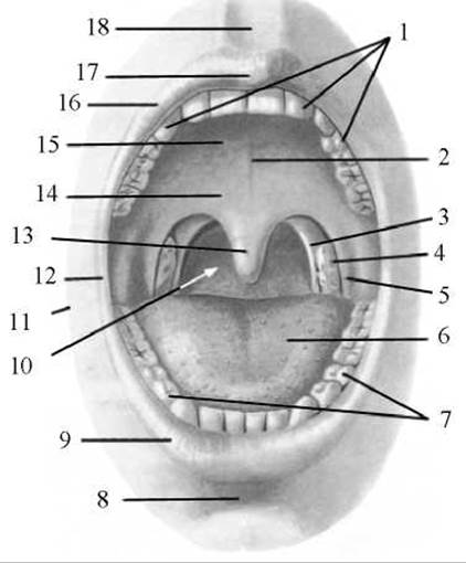 1 — верхня зубна дуга; 2 — піднебінний шов; 3 — піднебінно-глоткова дужка; 4 — піднебінний мигдалик; 5 — піднебінно-язикова дужка; 6 — спинка язика; 7 — нижня зубна дуга; 8 — підборідно-губна борозна; 9 — нижня губа; 10 — перешийок зіва; 11 — щока; 12 — спайка губ; 13 — піднебінний язичок; 14 — м’яке піднебіння; 15 — тверде піднебіння; 16 — верхня губа; 17 — горбок верхньої Губи; 18 — підносовий жолоб (фільтр)