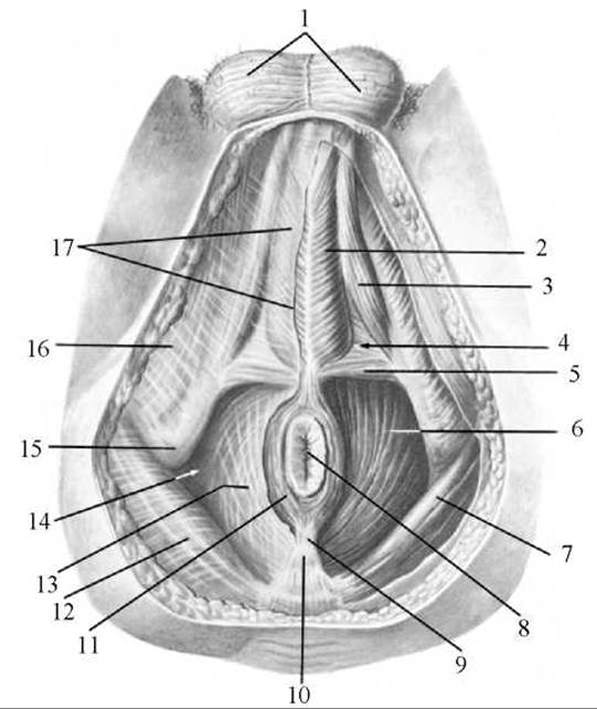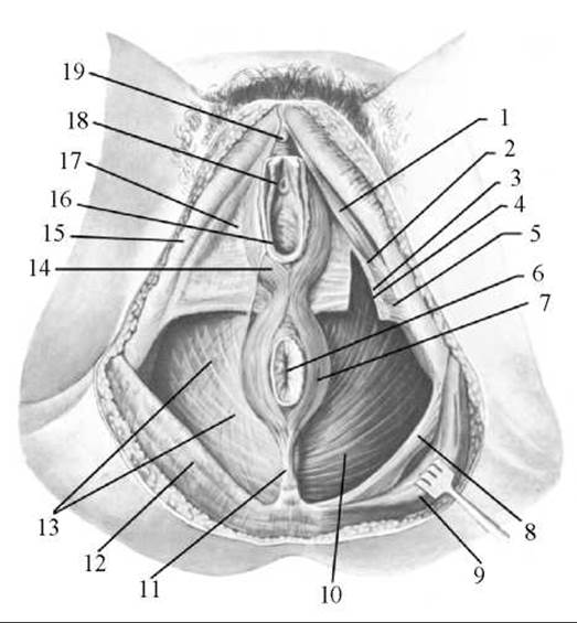 1 — сідничо-печеристий м’яз; 2 — нижня фасція сечово-статевої діафрагми; 3 — глибокий поперечний м’яз промежини; 4 — верхня фасція сечово-статевої діафрагми; 5 — поверхневий поперечний м’яз промежини; 6 — відхідник; 7 — зовнішній м’яз-замикач (сфінктер) відхідника; 8 — крижово-горбова зв’язка; 9 — великий сідничний м’яз; 10 — м’яз-підіймач відхідника; 11 — відхідниково-куприкова зв’язка; 12 — сіднична фасція; 13 — нижня фасція діафрагми таза; 14 — цибулино-губчастий м’яз; 15 — широка фасція; 16 — отвір піхви; 17 — поверхнева фасція промежини; 18 — зовнішнє вічко (отвір) сечівника, 19 — головка клітора