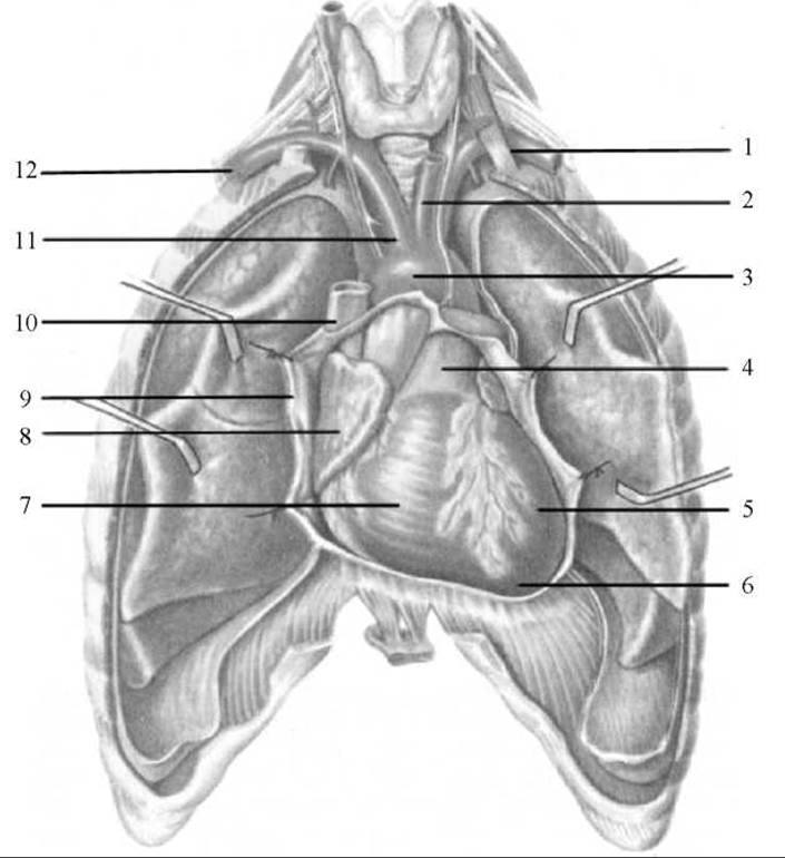 1 — ліва Підключична артерія; 2 — ліва спільна сонна артерія; 3 — дуга аорти; 4 — легеневий стовбур; 5 — лівий шлуночок; 6 — верхівка серця; 7 — правий шлуночок; 8 — праве передсердя; 9 — осердя; 10 — Верхня порожниста вена; 11 — плечоголовний стовбур; 12 — права підключична артерія