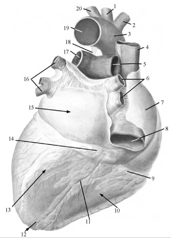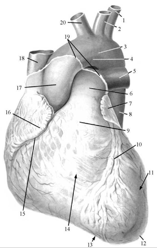 1 — ліва підключична артерія; 2 — ліва спільна сонна артерія; 3 — дуга аорти; 4 — перешийок аорти; 5 — ліва легенева артерія; 6 — легеневий стовбур; 7 — ліве вушко; 8 — низхідна частина аорти; 9 — артеріальний конус (лійка); 10 — передня міжшлуночкова борозна; 11 — лівий шлуночок; 12 — верхівка серця; 13 — вирізка верхівки серця; 14 — правий шлуночок; 15 — вінцева борозна; 16 — праве вушко; 17 — висхідна частина аорти; 18 — верхня порожниста вена; 19 — місце переходу перикарда в епікард; 20 — плечоголовний стовбур