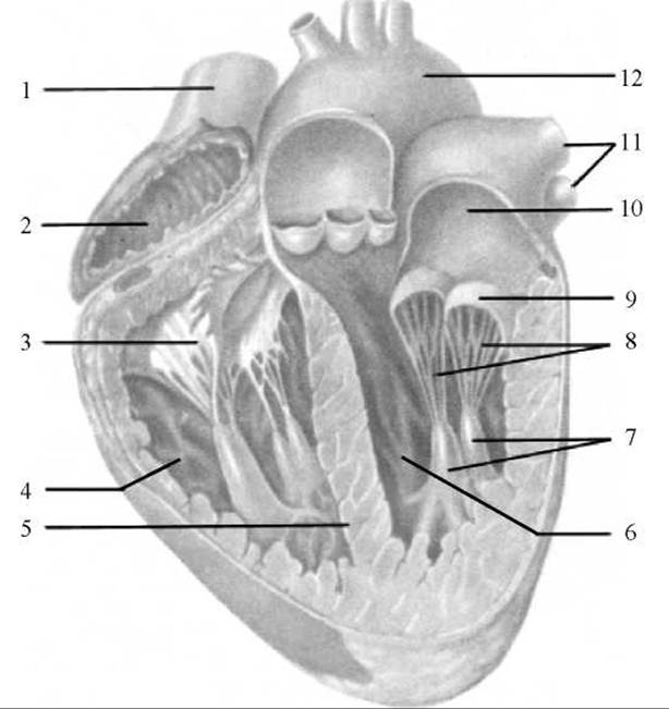 1 — верхня порожниста вена; 2 — праве передсердя; 3 — правий передсердно-шлуночковий клапан; 4 — правий шлуночок; 5 — міжшлуночкова перегородка; 6 — лівий шлуночок; 7 — сосочкові м’язи; 8 — сухожилкові струни; 9 — лівий передсердно-шлуночковий клапан; 10 — ліве передсердя; 11 — легеневі вени; 12 — дуга аорти