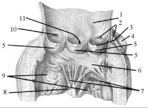 1 — аорта розрізана і розгорнута; 2 — ліва вінцева артерія; 3 — вузлик півмісяцевої заслінки; 4 — ліве вушко; 5 — півмісяцеві заслінки; 6 — лівий передсердно-шлуночковий (мітральний) клапан; 7 — сухожилкові струни; 8 — сосочкові м’язи; 9 — лівий шлуночок; 10 — отвір (устя) правої вінцевої Артерії; 11 — пазуха аорти — порожнина, обмежена півмісяцевою заслінкою і стінкою аорти