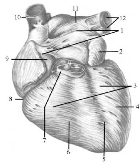 1 — міокард передсердь; 2 — ліве вушко; 3 — міокард шлуночків; 4 — лівий шлуночок; 5 — передня міжшлуночкова борозна; 6 — правий шлуночок; 7 — легеневий стовбур; 8 — вінцева борозна; 9 — праве передсердя; 10 — Верхня порожниста вена; 11 — ліве передсердя; 12 — ліві Легеневі вени