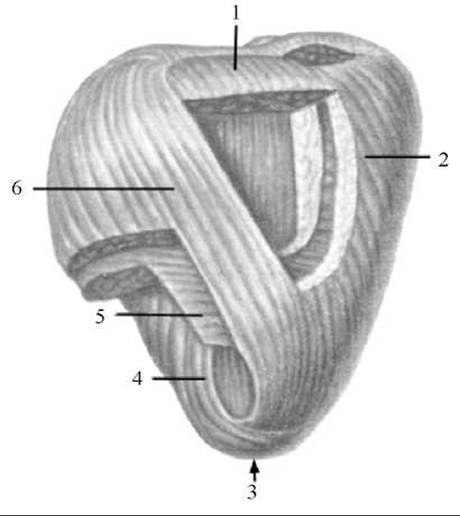 1 — волокна міокарда (поверхневий шар), які йдуть від лівого фіброзного кільця; 2 — поверхневий (поздовжній) шар міокарда в стінці правого шлуночка; 3 — завиток серця; 4 — глибокий (поздовжній) шар міокарда в стінці лівого шлуночка; 5 — середній (циркулярний) шар міокарда в стінці лівого шлуночка; 6 — поверхневий (поздовжній) шар міокарда в стінці лівого шлуночка