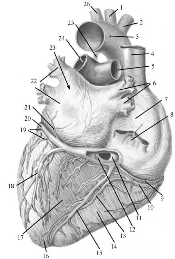 1 — ліва спільна сонна артерія; 2 — плечоголовний стовбур; 3 — дуга аорти; 4 — верхня порожниста вена; 5 — права легенева артерія; 6 — праві Легеневі вени; 7 — праве передсердя; 8 — нижня порожниста вена; 9 — мала вена серця; 10 — права вінцева артерія; 11 — заслінка (клапан) вінцевої пазухи; 12 — вінцева пазуха серця; 13 — задня міжшлуночкова гілка правої вінцевої артерії; 14 — правий шлуночок; 15 — середня вена серця; 16 — верхівка серця; 17 — лівий шлуночок; 18 — задня вена лівого шлуночка; 19 — огинаюча гілка лівої вінцевої артерії; 20 — велика вена серця; 21 — коса вена лівого передсердя; 22 — ліві легеневі вени; 23 — ліве передсердя; 24 — ліва легенева артерія; 25 — артеріальна зв’язка; 26 — ліва підключична артерія