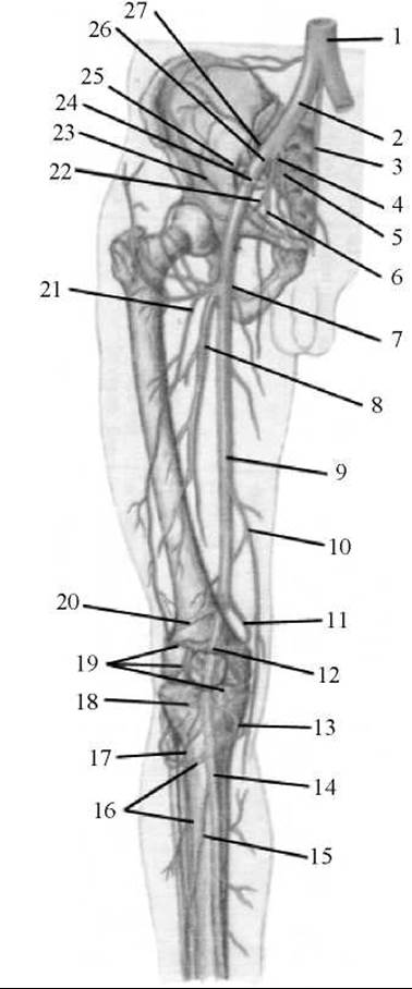1 — Черевна частина аорти; 2 — спільна клубова артерія; 3 — серединна крижова артерія; 4 — внутрішня клубова артерія; 5 — бічна крижова артерія; 6 — затульна артерія; 7 — присередня артерія, огинаюча стегнову кістку; 8 — глибока артерія стегна; 9 — стегнова артерія; 10 — низхідна колінна артерія; 11 — присередня верхня колінна артерія; 12 — підколінна артерія; 13 — присередня нижня колінна артерія; 14 — задня великогомілкова артерія; 15 — малогомілкова артерія; 16 — передня великогомілкова артерія; 17 — передня поворотна великогомілкова артерія; 18 — бічна нижня колінна артерія; 19 — колінна суглобова (артеріальна) сітка; 20 — бічна верхня колінна артерія; 21 — бічна артерія, огинаюча стегнову кістку; 22 — нижня сіднична артерія; 23 — глибока огинаюча клубова артерія; 24 — нижня надчеревна артерія; 25 — верхня сіднична артерія; 26 — зовнішня клубова артерія; 27 — клубово-поперекова артерія