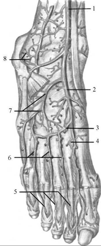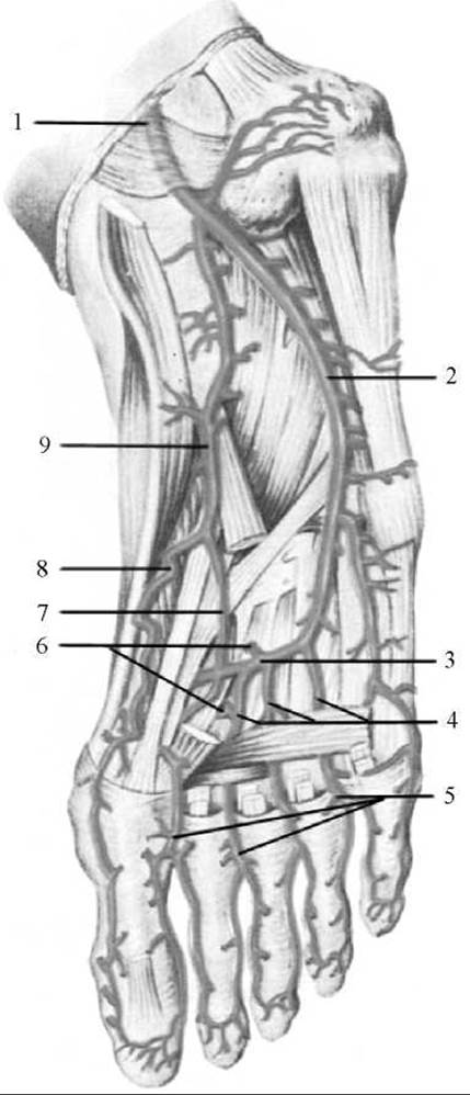 1 — передня виликогомілкова артерія; 2 — тильна артерія стопи; 3 — дугоподібна артерія; 4 — глибока підошовна гілка; 5 — тильні пальцеві артерії; 6 — тильні плеснові артерії; 7 — бічна передплеснова артерія; 8 — бічна кісточкова сітка