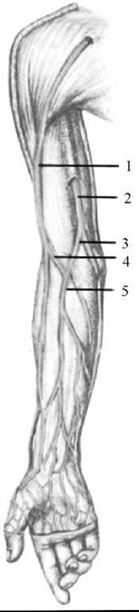 1 — бічна підшкірна (головна) вена руки; 2 — присередня підшкірна (княжа) вена руки; 3 — присередня підшкірна серединна вена; 4 — бічна підшкірна серединна вена; 5 — серединнна вена ліктя