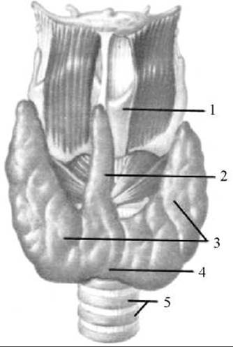 1 — щитоподібний Хрящ; 2 — пірамідальна частка; 3 — права та ліва частки; 4 — перешийок щитоподібної залози; 5 — Трахея