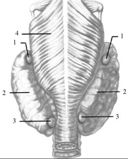 1 — верхні прищитоподібні залози; 2 — Щитоподібна залоза; 3 — нижні прищитоподібні залози; 4 — Глотка