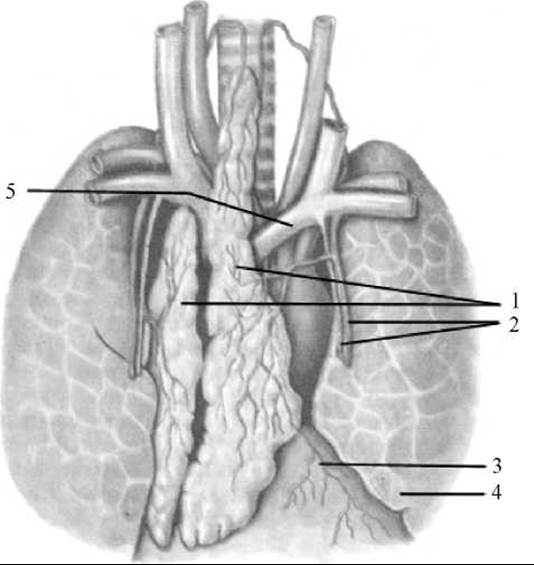 1 — вилочкова залоза (права та ліва частки); 2 — внутрішні грудні артерія та вена; 3 — осердя (перикард); 4 — ліва легеня; 5 — ліва плечоголовна вена