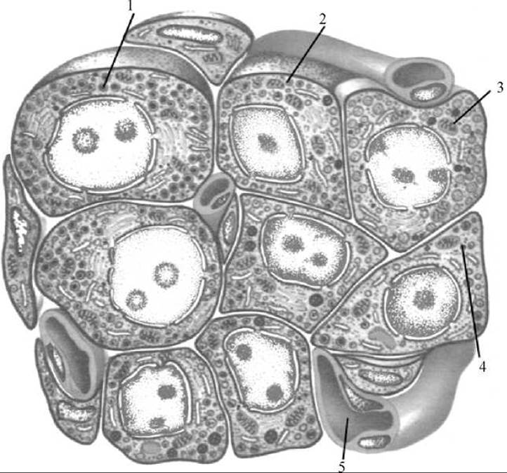 1 — альфа-Клітина; 2 — бета-клітина; 3 — дельта-клітина; 4 — РР-клітина; 5 — кровоносний капіляр