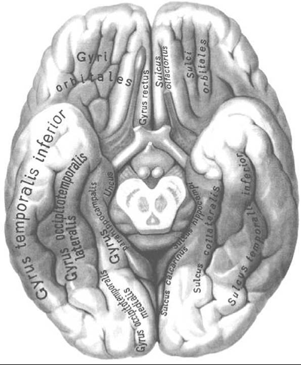 Мал. 243. Основа (нижня поверхня) великого мозку (за Р. Д. Синельниковим)