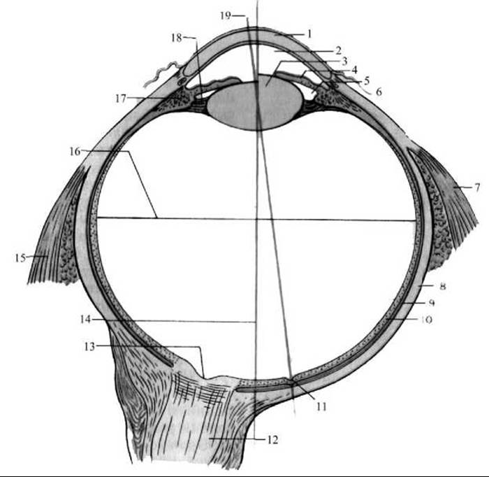 1 — рогівка; 2 — передня камера очного яблука; 3 — кришталик; 4 — райдужка; 5 — задня камера очного яблука; 6 — кон’юнктива; 7 — прямий бічний м’яз; 8 — склера; 9 — власна судинна оболонка; 10 — сітківка; 11 — центральна ямка; 12 — Зоровий нерв; 13 — заглибина диска; 14 — зовнішня вісь очного яблука; 15 — прямий присередній м’яз; 16 — поперечна вісь очного яблука; 17 — війкове тіло; 18 — війковий поясок; 19 — зорова вісь