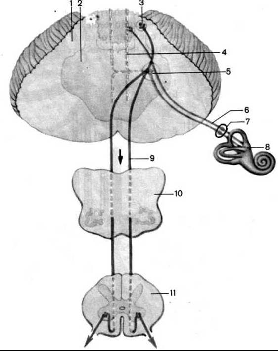 1 — мозочок; 2 — Міст; 3 — Ядро шатра; 4 — задній поздовжній пучок; 5 — присінкові (вестибулярні) ядра; 6 — присінкова (вестибулярна) частина присінково-завиткового нерва; 7 — вестибулярний вузол; 8 — Внутрішнє Вухо; 9 — присінково-спинномозковий шлях; 10 — розріз довгастого мозку; 11 — розріз спинного мозку