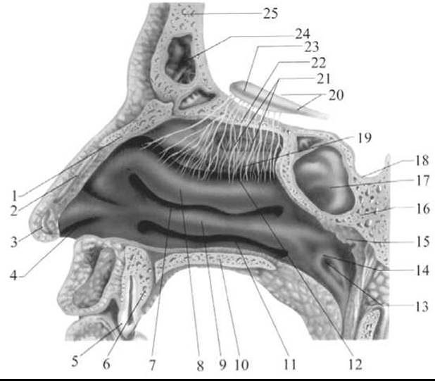 1 — Носова кістка; 2 — верхній носовий Хрящ; 3 — нижній носовий хрящ; 4 — присінок носа; 5 — Зуби; 6 — верхня шелепа; 7 — середній носовий хід; 8 — середня носова раковина; 9 — нижня носова раковина; 10 — Піднебінна кістка; 11 — нижній носовий хід; 12 — верхній носовий хід; 13 — отвір Євстахієвої труби; 14 — трубне підвищення; 15 — глоткова мигдалина й аденоїди; 16 — Клиноподібна кістка; 17 — клиноподібна пазуха; 18 — турецьке сідло; 19 — верхня носова раковина; 20 — нюховий тракт; 21 — нюхові волокна; 22 — Решітчаста кістка; 23 — нюхова цибулина; 24 — лобова пазуха; 25 — Лобова кістка