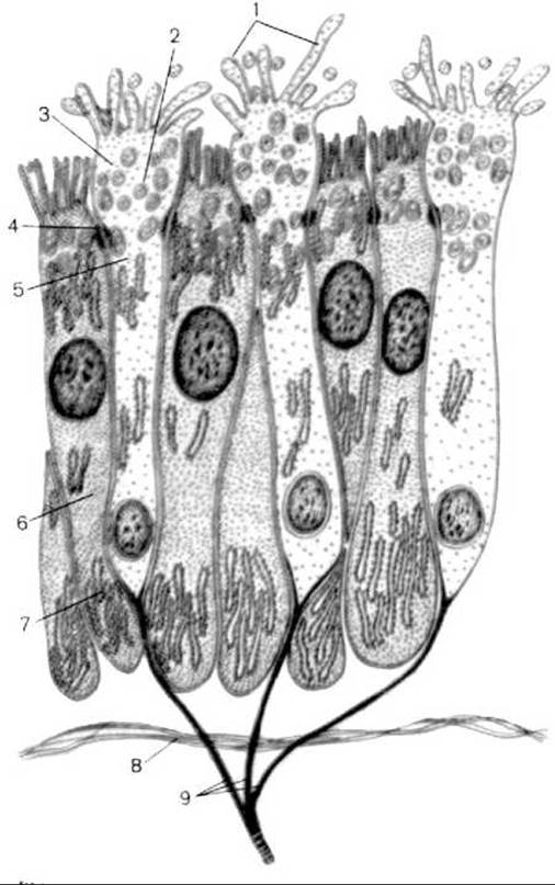 1 — мікроворсинки; 2 — пухирці; 3 — нюхова булава; 4 — замикаюча пластинка (десмосома); 5 — тіло нюхової нейросенсорної клітини; 6 — підтримуюча Клітина; 7 — ендоплазматична сітка; 8 — базальна мембрана; 9 — аксони нюхових нейросенсорних клітин, які утворюють нюхові нитки