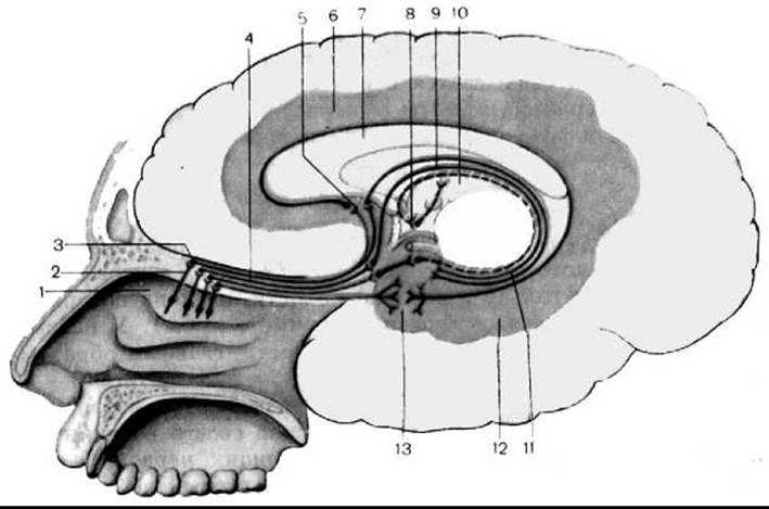 1 — верхня носова раковина; 2 — нюхові нерви (І пара); 3 — нюхова цибулина; 4 — нюховий тракт; 5 — підмозолисте поле; 6 — поясна закрутка; 7 — мозолисте тіло; 8 — сосочкоподібне тіло; 9 — склепіння; 10 — задній таламус; 11 — зубчаста закрутка; 12 — парагіпокампальна закрутка; 13 — гачок