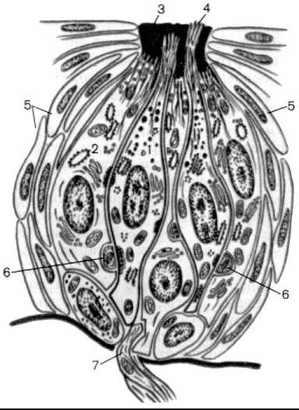 1 — смакова Клітина; 2 — підтримуюча клітина; 3 — смакова пора; 4 — мікроворсинки; 5 — епітеліальна клітина; 6 — нервові закінчення; 7 — нервове волокно
