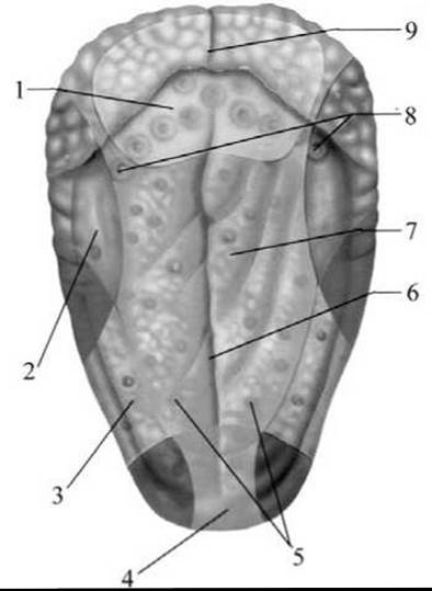 1 — сприйняття гіркого смаку; 2 — сприйняття кислого смаку; 3 — сприйняття солоного смаку; 4 — сприйняття солодкого смаку; 5 — грибоподібні сосочки; 6 — серединна борозна; 7 — спинка язика; 8 — жолобуваті (валикоподібні) сосочки; 9 — корінь