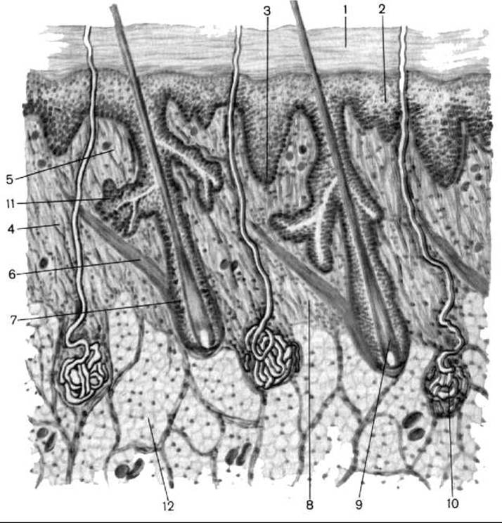 1 — роговий шар; 2 — епідерміс; 3 — базальний шар; 4 — сполучнотканинні волокна (колагенові, еластичні та ретикулярні) і клітини; 5 — сосочковий шар; 6 — пучки міоцитів; 7 — волосяна цибулина; 8 — сітчастий шар; 9 — корінь волосини; 10 — потова залоза; 11 — сальна залоза; 12 — дольки жирової тканини