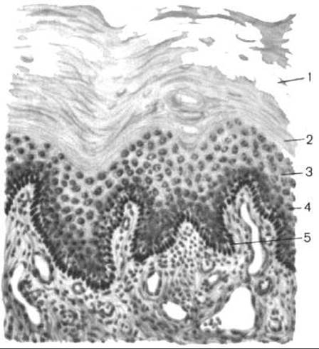 1 — роговий шар; 2 — блискучий шар; 3 — зернистий шар; 4 — шипуватий шар; 5 — базальний шар (циліндричний шар)