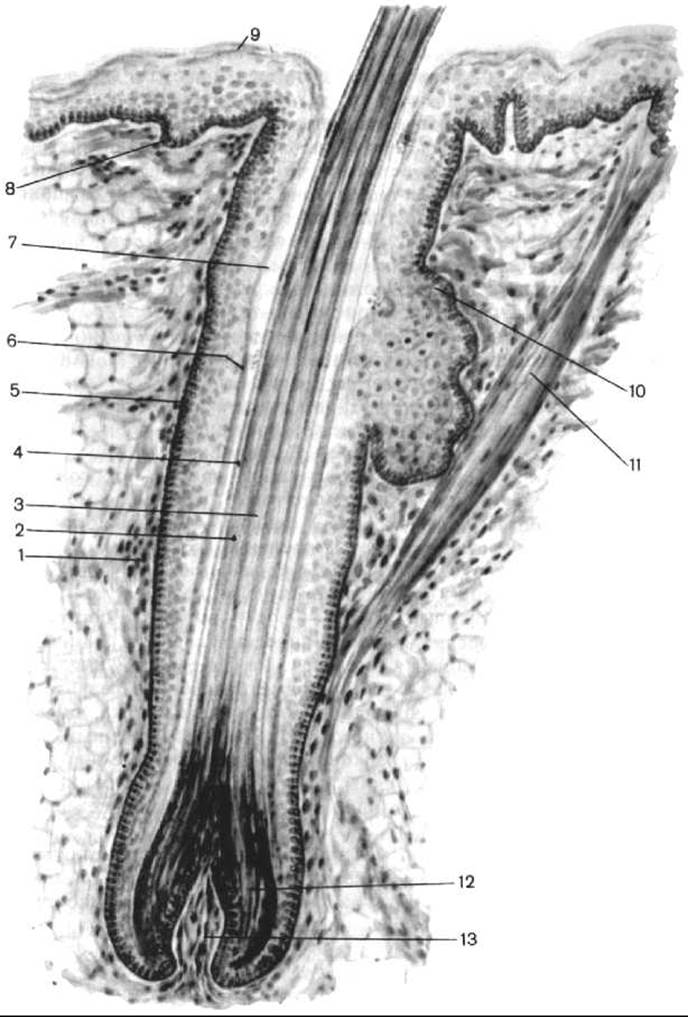 1 — волосяна сумка; 2 — кора волосини; 3 — мозкова речовина волосини; 4 — кутикула; 5 — зовнішня коренева Піхва; 6 — два шари внутрішньої кореневої піхви; 7 — волосяна лійка; 8 — базальний (ростковий) шар епідермісу; 9 — роговий шар епідермісу; 10 — сальна залоза; 11 — м’яз-піднімач волосини; 12 — цибулина волосини; 13 — сосочок волосини