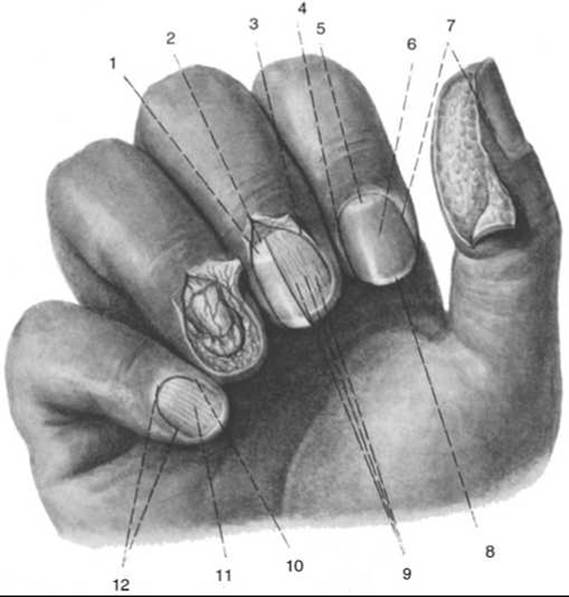 Мал. 286. Нігті (права кисть). На великому пальці знята ділянка шкіри з підшкірною клітковиною (за Р. Д. Синельниковим)