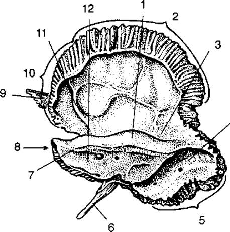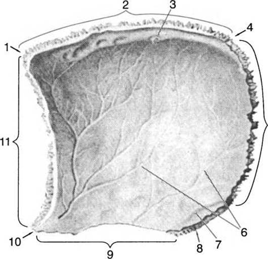 1 — лобовий кут; 2 — стрілоподібний край; 3 — борозна верхньої стрілової пазухи; 4 — потиличний кут; 5 — потиличний край; 6 — артеріальні борозни; 7 — борозна сигмоподібної пазухи; 8 — соскоподібний кут; 9 — лускоподібний край; 10 — клиноподібний кут; 11 — лобовий край