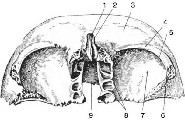 1 — носова частина; 2 — надперенісся; 3 — надбрівні дуги; 4 — надочноямковий край; 5 — ямка слізної залози; 6 — виличний відросток; 7 — очноямкова поверхня; 8 — решітчасті отвори; 9 — решітчаста вирізка