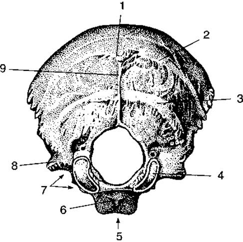 1 — внутрішня потилична горбистість; 2 — верхня вийна лінія; 3 — нижня вийна лінія; 4 — потиличний виросток; 5 — основна частина; 6 — глотковий горбок; 7 — яремна вирізка; 8 — яремний відросток; 9 — зовнішній потиличний гребінь