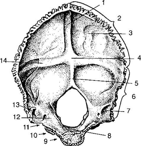 1 — борозна верхньої стрілової (сагітальної) пазухи; 2 — лямбдоподібний край; 3 — потилична луска; 4, 14 — внутрішня потилична горбистість; 5 — внутрішній потиличний гребінь; 6 — соскоподібний край; 7 — борозна сигмоподібної пазухи; 8 — схил; 9 — основна частина; 10 — бічна частина; 11 — яремна вирізка; 12 — яремний відросток; 12 — борозна поперечної пазухи