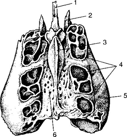 1 — перпендикулярна пластинка; 2 — середня носова раковина; 3 — півнячий гребінь; 4 — решітчастий лабіринт; 5 — очноямкова пластинка; 6 — решітчаста пластинка
