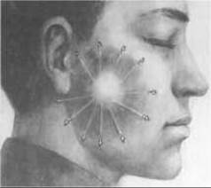 Мал. 324. Внутрішньотканинне опромінення пухлини привушної залози.
