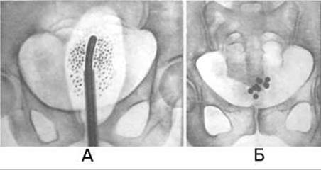 Б - кульки з радіоактивного кобальту у сечовому міхурі.