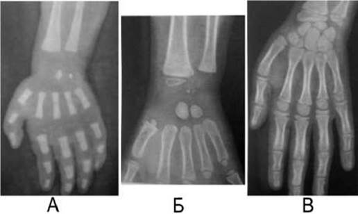 Мал. 31. Рентгенограми кисті дитини у віці 1 року (А), 3 років (Б), 7 років (В).