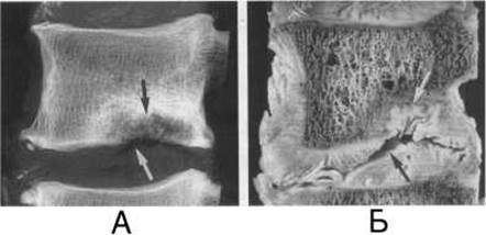 Мал. 67. Остеохондроз на рентгенограмі (А) та сагітальному розтині препарата (Б). Внутрішньогубчаста грижа (стрілки).