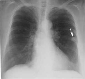 Мал. 122. Периферійний рак лівої легені (стрілка) на оглядовій рентгенограмі органів грудної клітки.