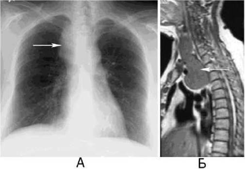 Мал. 132. Загрудинний зоб (стрілка) на рентгенограмі (А) та магнітно-резонансній томограмі (Б).