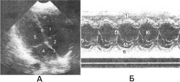 Б - одновимірна ехокардіографія: 1 - правий шлуночок; 2 - міжшлуночкова перегородка; 3 - лівий шлуночок; 4 - передня стінка мітрального клапана; 5 - задня стінка мітрального клапана; 6 - задня стінка лівого шлуночка.