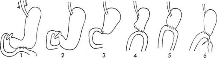1 - гастроентероанастомоз; 2 - пілоропластика; 3 - резекція шлунка за Більрот-І; 4 - резекція шлунка за Більрот-ІІ в модифікації Фінстерера; 5 - резекція шлунка за Більрот-ІІ в модифікації Поліа; 6 - пептична виразка відвідної петлі.