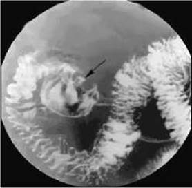 При контрастному рентгенологічному дослідженні ніжний перистий малюнок зникає, складки слизової оболонки тонкої кишки стають набряклими, потовщеними, внаслідок чого вся стінка є малорухомою, тонус її змінений: на одних ділянках знижений, на інших - підвищений. Одні ВІДДІЛИ ТОНКОЇ КИШКИ помірно розширені, у них визначаються скупчення газу і горизонтальні рівні, а інші відділи, навпаки, спастично укорочені. Місцями внутрішня поверхня кишки згладжена, безструктурна, заповнення відбувається нерівномірно, розрізненими сегментованими ділянками (симптом сегментації). Часто контрастна речовина розкидана в тонкому кишечнику у вигляді невеликих пластівців - симптом флокуляції (мал. 188).