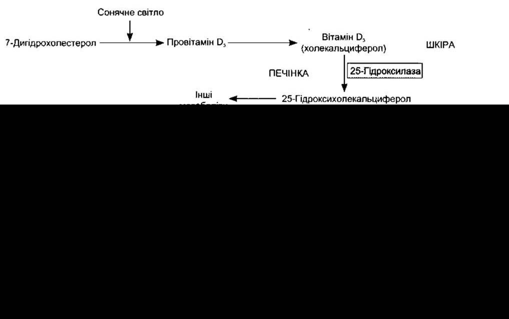 Метаболізують вітамін D3 ензими, що є членами надродини цитохрому Р450 (CYP) (див. Розділи 17 і 20). У печінці вітамін D3 перетворюється в 25-гідроксихолекальциферол (кальцидіол, 25-OHD3), а той у клітинах проксимальних канальців нирок - в активніший метаболіт 1,25-дигідроксихолекальциферол, який ще називають кальцитріолом, чи 1,25-(OH)2D3. Також 1,25-дигідроксихолекальциферол утворюється в плаценті, у кератиноцитах шкіри та в макрофагах. У пацієнтів з саркоідозом 1,25-дигідроксихолекальциферол утворюють легеневі альвеолярні макрофаги, очевидно, в разі стимулювання у-інтерфероном. Нормальний рівень у плазмі 25-гідроксихолекальциферолу становить близько 30 нг/мл, а рівень 1,25-дигідроксихолекальциферолу - 0,03 нг/мл (100 пмоль/л). Менш активний метаболіт - 24,25-дигідроксихолекальциферол - теж утворюється в нирках (див. рис. 21-7).