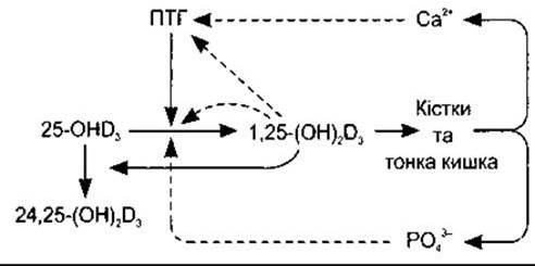 Утворення 25-гідроксихолекальциферолу, здається, не регульоване надто суворо. Проте формування 1,25-дигідроксихолекальциферолу в нирках, яке каталізує 1а-гідроксилаза, регульоване за механізмом зворотного зв’язку вмістом Са2+ та РО43 у плазмі (рис. 21-8). Його утворення прискорює паратгормон, і коли рівень Са2+ в плазмі низький, то секреція паратгормону збільшується. Якщо ж рівень Са2+ у плазмі високий, то утворюється мало 1,25-дигідроксихолекальциферолу, і нирки, натомість, продукують порівняно неактивний метаболіт 24,25-дигідроксихолекальциферол. Цей вплив Са2+ на утворення 1,25-дигідроксихолекальциферолу є механізмом, що забезпечує адаптацію абсорбції Са2+ з кишки (див. вище). Утворення 1,25-дигідроксихолекальциферолу також пришвидшує дія низьких, а сповільнює дія високих рівнів РO43 у плазмі, безпосередньо пригнічуючи вплив РО43 на 1а-гідроксилазу. Додаткове контролювання за утворенням 1,25-дигідроксихолекальциферолу відбувається за допомогою безпосереднього негативного зворотного зв’язку метаболіту на 1а-гідроксилазу, позитивної зворотної дії на формування 24,25-дигідроксихолекальциферолу та безпосередньої дії паращитоподібної залози - інгібування утворення мРНК для паратгормону. Пролактин посилює активність 1а-гідроксилази, і кількість 1,25-дигідроксихолекальциферолу, що циркулює, збільшена під час лактації. Естроген збільшує загальну кількість 1,25-дигідроксихолекальциферолу, що циркулює, однак цей вплив, імовірно, відбувається внаслідок збільшення секреції його зв’язувального білка без помітної зміни вільного 1,25-дигідроксихолекальциферолу. Гіпертиреоїдизм пов’язаний зі зменшенням 1,25-дигідроксихолекальциферолу, що циркулює, та збільшеною частотою остеопорозу. Утворення 1,25-дигідроксихолекальциферолу пригнічуване метаболічним ацидозом. Гормон росту, ХСл та Кальцитонін також стимулюють утворення 1.25-дигідроксихолекальциферолу.