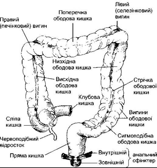 Діаметр товстої кишки більший, ніж тонкої. У нормі в дорослих довжина товстої кишки - 100 см і понад 150 см на аутопсії. Волокна її зовнішнього м’язового шару зібрані у три поздовжні смужки - стрічки ободової кишки. Проте ці стрічки коротші, ніж решта кишки, і стінки товстої кишки утворюють випини (гаустри) між стрічками ободової кишки (рис. 26-30). У слизовій товстої кишки нема ворсинок. Залози ободової кишки - це короткі внутрішні випинання слизової, що секретують слиз. Тут наявні поодинокі лімфатичні вузлики, особливо у сліпій кишці і червоподібному відростку.