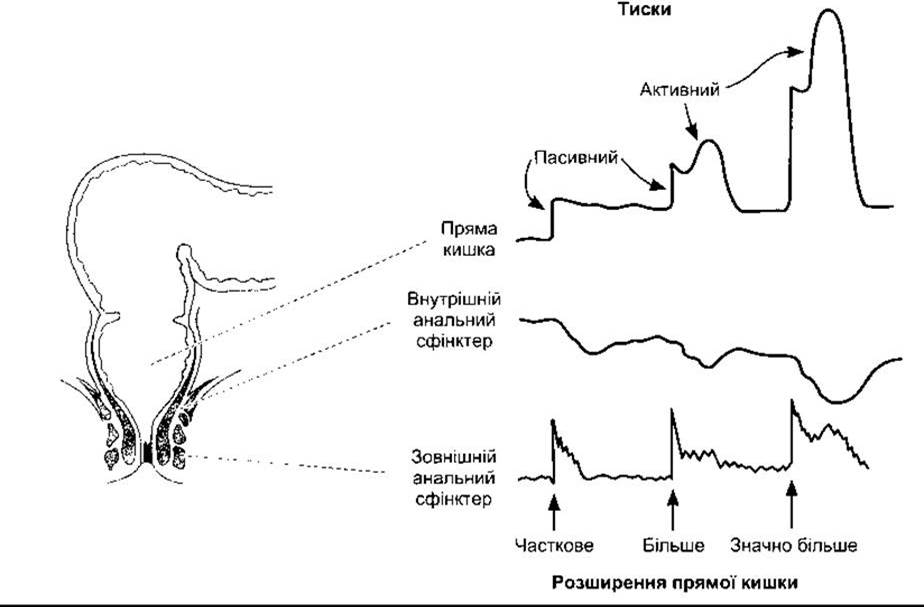 Розширення прямої кишки каловими масами розпочинає рефлекторні скорочення м’язів кишки і зумовлює появу поклику до дефекації. У людей симпатична іннервація внутрішнього (мимовільного) анального сфінктера є збуджувальною, тоді як парасимпатична іннервація є інгібувальною. Цей сфінктер розслабляється, коли пряма кишка розширена. Нервову іннервацію зовнішнього анального сфінктера, що належить до скелетних м’язів, забезпечує соромітний нерв. Сфінктер підтримується у стані тонічного скорочення, і помірне розтягнення прямої кишки збільшує силу її скорочень (рис. 26-31). Перше спонукання до дефекації виникає, коли тиск у прямій кишці збільшується до 18 мм рт. ст. Коли цей тиск підвищується до 55 мм рт. ст., то зовнішній, як і внутрішній сфінктер, розслаблюється, і вміст прямої кишки виштовхується. Внаслідок саме цього рефлекторна евакуація з прямої кишки відбувається і в хронічних спінальних хворих людей, і в тварин. Перш ніж тиск, що розслаблює зовнішній анальний сфінктер, пошириться, розпочинається дефекація внаслідок вольового розслаблення зовнішнього сфінктера та скорочення черевних м’язів (через напруження) для допомоги рефлекторному випорожненню розширеної прямої кишки. Дефекація - це спінальний рефлекс, він може бути вольово пригнічений утримуванням скорочення зовнішнього сфінктера або полегшений унаслідок розслаблення сфінктера та скорочень черевних м’язів.