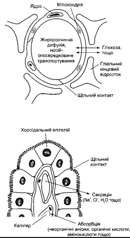 Рис. 32-2. Угорі: транспортування через мозкові капіляри. Внизу: транспортування через клітини хороїдального сплетення (модифіковано з Fishman RA: Cerebrospinal Fluid in Diseases of the Nervous System, 2nd ed. Saunders, 1992).
